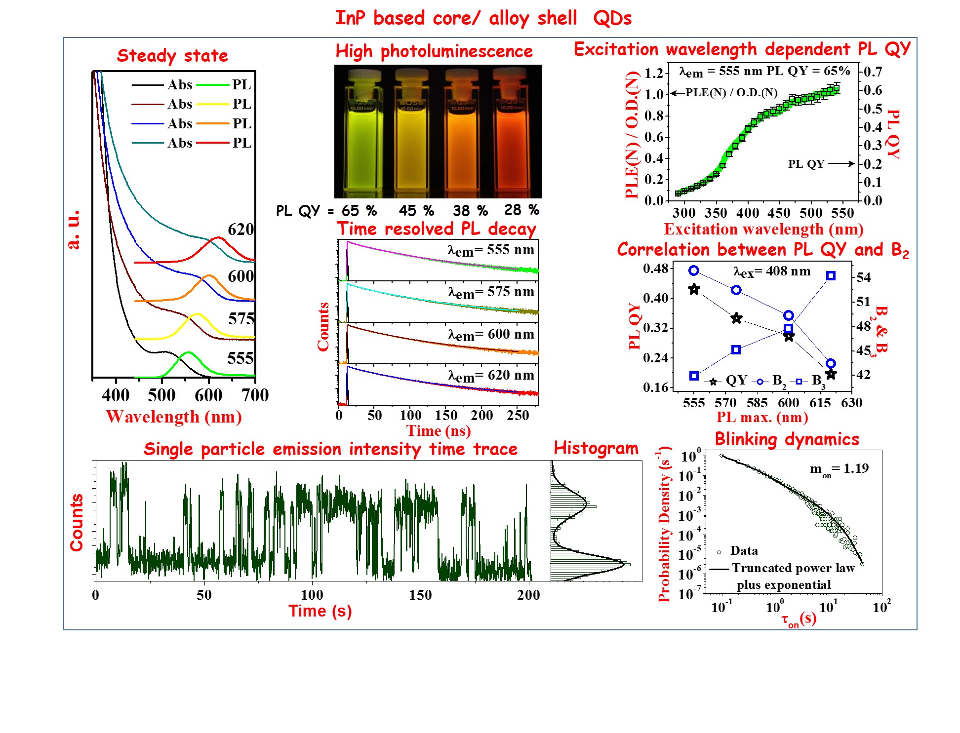 "Highly Photoluminescent InP Based Core Alloy Shell QDs from Air- Stable Precursors: Excitation Wavelength Dependent Photoluminescence Quantum Yield, Photoluminescence Decay Dynamics, and Single Particle Blinking Dynamics",