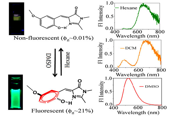 Solvent H-bond accepting ability induced conformational change and its influence towards fluorescence enhancement and dual fluorescence of hydroxy meta-GFP chromophore analogue",