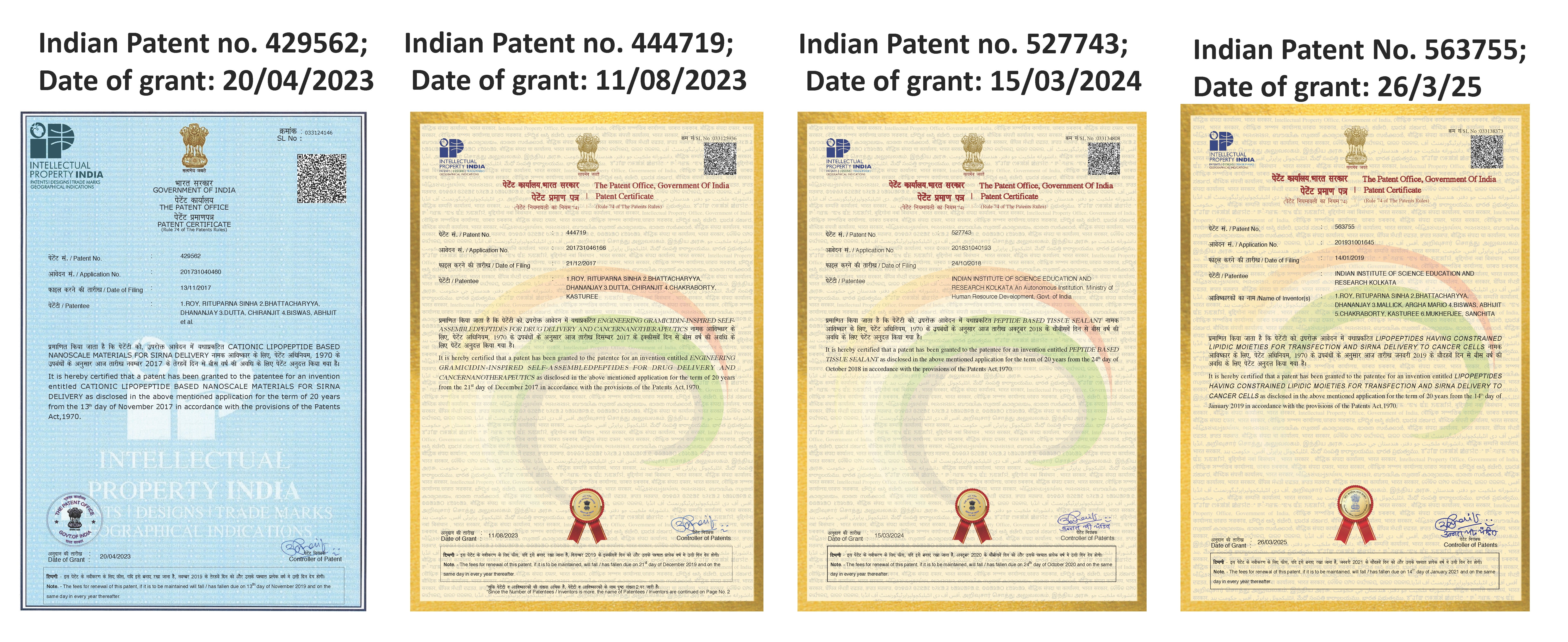 1. “Engineering gramicidin-inspired self-assembled peptides for Drug Delivery and Cancer Nanotherapeutics”; Patent no. 444719; Date of grant: 11/08/2023